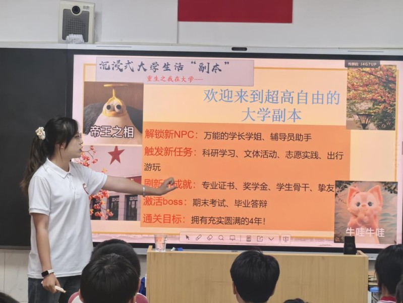 活动中,陈鈱、张尧杰结合图片与案例,从学习模式、社团活动、社会实践等方面介绍了大学生活的日常,并重点分享了高中阶段的时间管理方法和心态调整技巧。“大学提供了更多选择,但前提是当下的每一份努力。”陈鈱以自身备战高考的经历为例,强调了坚持与规划的重要性。张尧杰则通过互动问答,引导同学们思考“未来想成为怎样的人”,并针对“如何平衡学业与兴趣”等问题给出具体建议。