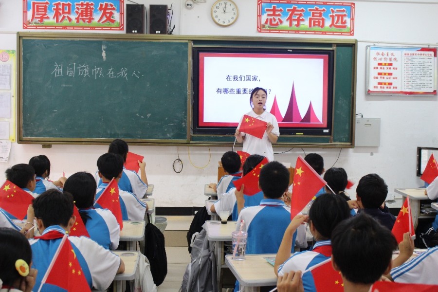 主题宣讲中,研究生支教团成员通过生动的故事、珍贵的历史影像,为学生们讲述国庆节的由来,以及国旗、国徽的来源及意义。