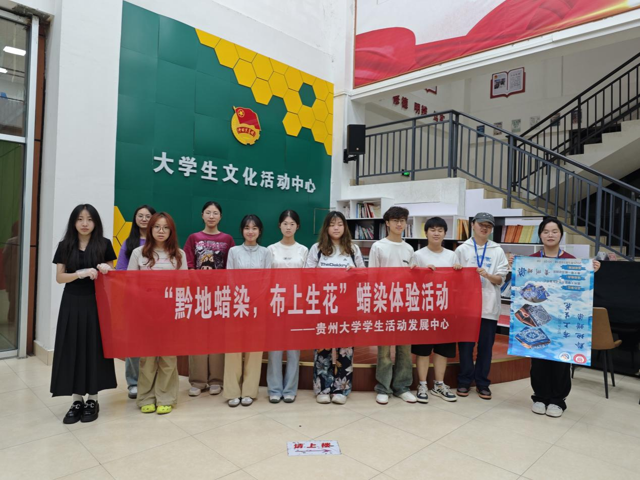 黔地蜡痕旧,染艺文脉长。贵州蜡染技艺源远流长,是苗族等世居民族代代相传的生活美学与文化符号。活动现场,同学们在指导下依次完成融蜡、绘纹、浸染与氧化晾晒等环节,不时有人轻声交流蜡刀运用的手感,或探讨靛蓝浸染的时长与成色变化。一位同学双手托起半干的染布,靛蓝底上渐显的白色纹样如水墨氤氲。她欣喜地说:“亲手做一次蜡染,才真正体会到非遗不只是书本上的名词,而是有温度、有生命力的记忆。这次活动让我离贵州的文化根脉更近了。”