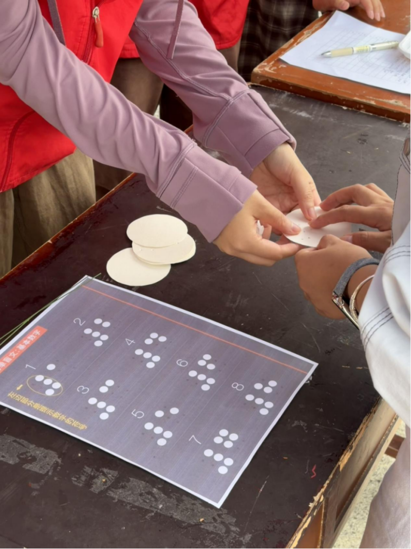 活动现场设置黑暗体验与盲人互动两大区域。在黑暗体验区,参与者通过触摸盲文卡片、触觉猜物、闻味辨物等环节,亲身感知视障群体的日常认知方式。互动区内,蒙眼自由拥抱与心声墙留言则成为情感交流的纽带,同学们在心声墙上留下“拥抱让人放下戒备,感受到纯粹的温暖”等感悟。