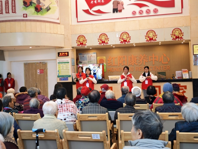 下午,志愿者们准时抵达睿悦红阳康养中心,在与院方沟通后,迅速投入现场布置工作,并热情迎接老人们有序入场。