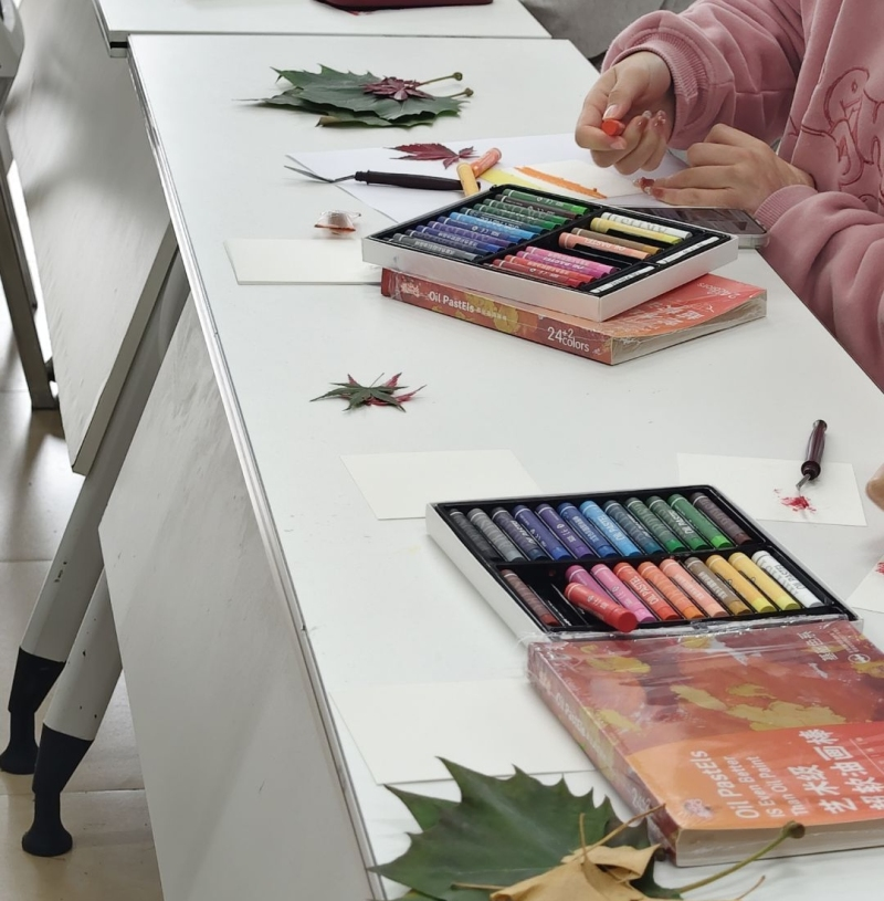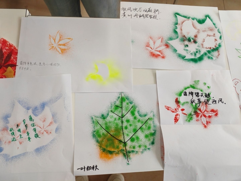 在“树叶拓印”游戏环节,学生有序地领取提前准备好的白纸、枫叶、蜡笔、马克笔等材料。学生用落叶做拓印,并在拓印处留下自己对霜降的节气寄语。