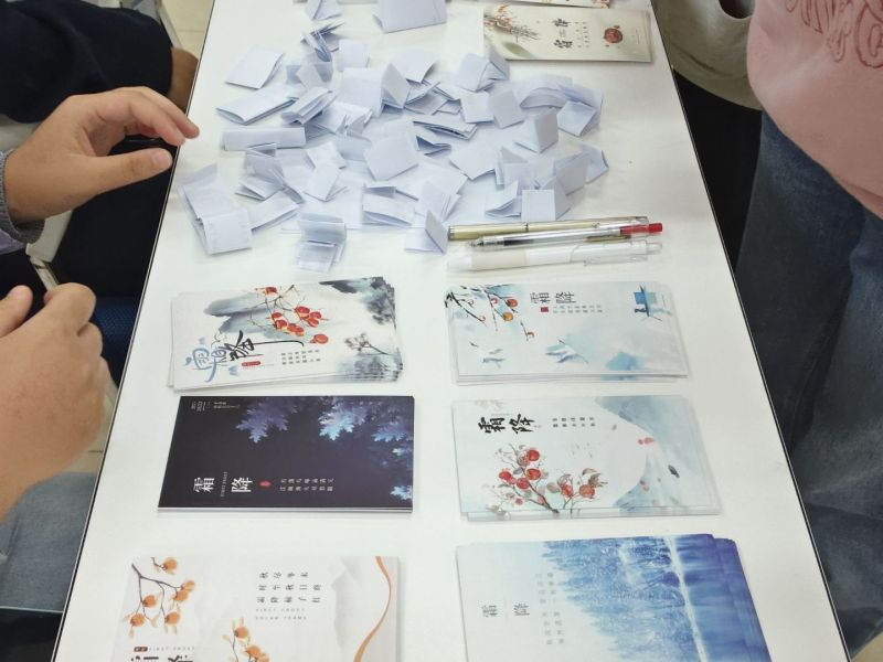 团委网站讯(记者 吴江灿 报道|摄影 郑雯 邹润东)为进一步丰富校园文化生活,10月25日,我校第二课堂运营中心在西校区雅文楼217B组织开展“霜华绘秋韵,游艺聚人心”文化小课堂活动。此活动旨在让大家熟悉了解“霜降”传统节气的相关知识,活动设置多项趣味活动,吸引百余人参与。
