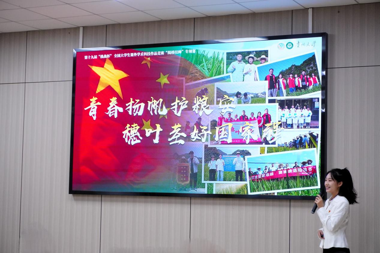 双创项目路演环节,“挑战杯”特等奖(擂主)项目《穗叶茎好——水稻新型生物源杀菌剂的创制与应用》、“国创赛”金奖项目《蝉音蜕变·莲花盛开——舞乐蝉歌非遗走向世界》依次进行展演。