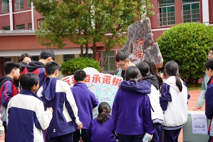 在贞丰县第二中学,研究生支教团成员采用“观看+承诺+实践”模式推动反霸凌教育。通过组织观看宣传片激发情感共鸣,设置反欺凌承诺展板引导学生签署个人承诺。
