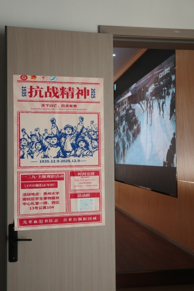 影片放映前,主持人以“一二·九运动与当代青年的责任”为主题作导入,简要回顾1935年北平学子抗日救亡的壮阔历史。随后,开始播放抗美援朝纪录电影《1950他们正年轻》,影片中志愿军老战士的亲历口述,将同学们带回战火纷飞的岁月,他们跨过鸭绿江、守住上甘岭,用青春守护家国。放映结束后,同学们积极交流发言,纷纷表示要努力学习专业知识,把个人理想融入国家发展大局,以真才实学报效祖国。