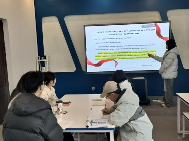 活动伊始,研支团成员孙婧馨领学“深入学习宣传贯彻习近平总书记给中国国际大学生创新大赛参赛学生代表的回信精神”,让大家思考如何将青春智慧融入强国伟业,将论文写在祖国大地上。