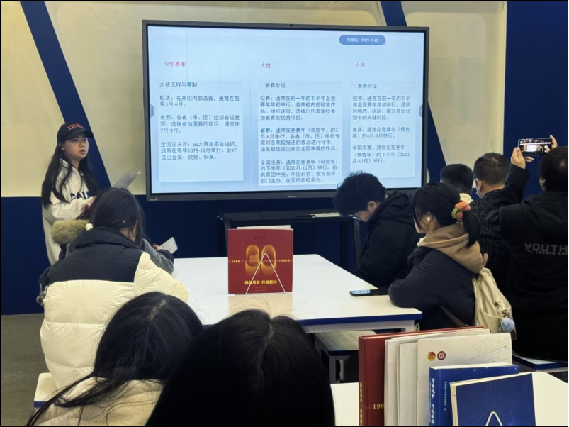 在“赛事图”环节,王诗雨首先解析了“大挑”与“小挑”的区别。她还详细介绍了“国创赛”赛事的特点;在文书撰写技巧方面,她对比分析了“挑战杯”与“国创赛”的文书要求差异,强调两大赛事均有其专属“黄金结构”,需根据赛事导向针对性打磨准备;在“信息差突围”部分,她分享了“三阶信息源与行动清单”,具体包括官方核心资源、校内生命线、社交网络层以及行动建议;在“路演”环节,她分享了“高效组队三步法”和“故事化路演的三板斧”;“实战笔记”环节,她结合案例从0到1的落地经历,分享了实战中的关键经验,反复强调理论与实践结合的重要性,鼓励同学们主动投身创新创业实践,在实操中锤炼综合能力。
