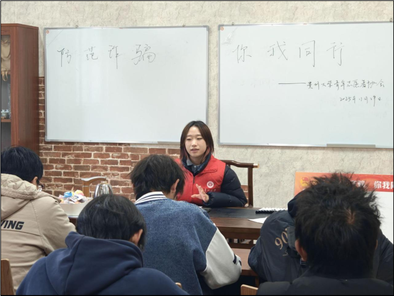 团委网站讯(记者 邰晓兰 报道|摄影 罗诗亿 辛永晖)为加强学生防范意识,提升学生反诈能力,11月29日,我校青年志愿者联合会(以下简称“青志联”)于西校区2栋、15栋宿舍楼活动室开展反诈宣传活动。