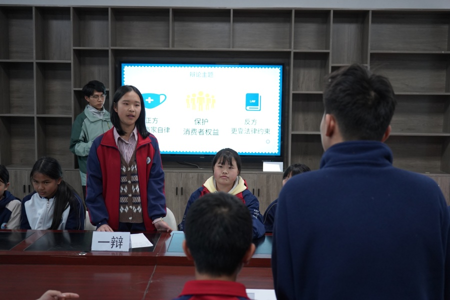 “守消费初心,护少年权益”法治与诚信辩论赛开辩。辩题围绕“保护消费者权益,更靠商家自律/更靠法律约束”展开,双方辩手逻辑清晰、论据充分,围绕商业伦理与制度保障的核心要义展开思辨。唇枪舌剑的交锋中,不仅展现了青年学子的思辨与表达能力,更让在场师生深刻理解消费维权中法治与诚信的辩证关系,进一步筑牢了法治信仰与诚信意识。