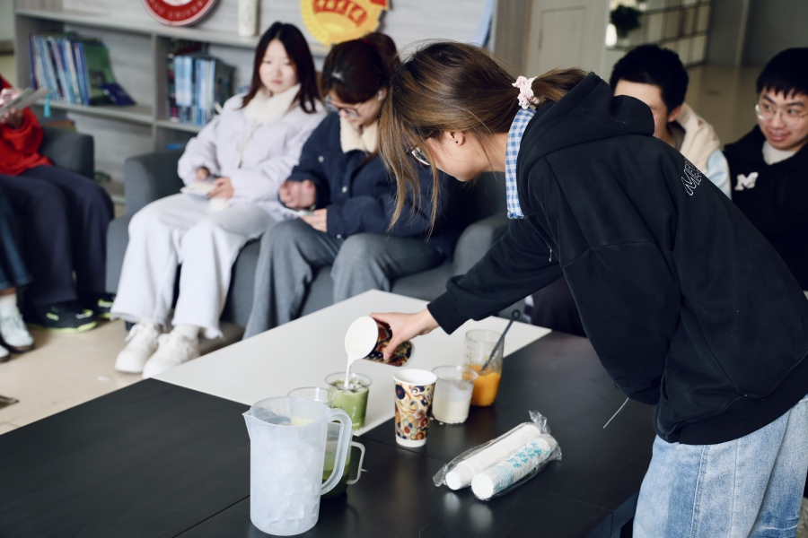 尾声,成功猜对海龟汤谜题的同学,可在现场自主参与茶饮DIY活动,在动手实践中放松身心、交流互动。茶饮制作过程中,同学们一边调配饮品,一边分享推理思路、交流科创竞赛经验。
