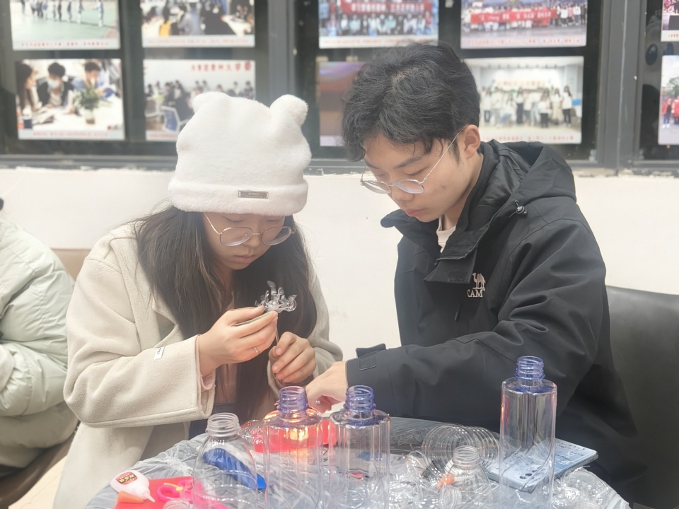 活动伊始,主持人姚安迪以“非遗琉璃技艺”为引,讲解了其历史渊源和美学特点,并演示了将塑料瓶转化为仿琉璃艺术品的制作流程。在工作人员的协助下,同学们领取了工具与材料,积极投入手工创作。