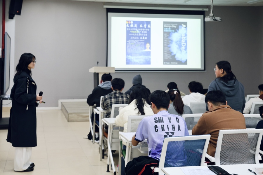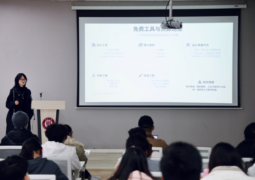 活动伊始,任梓铭结合自身丰富的设计经验,聚焦海报制作的五大常见误区,通过实例剖析逐一拆解海报中常见的布局混乱、重点模糊、素材滥用等典型问题,让同学们直观认识到设计中的核心禁忌。同时,她进一步指导大家科学合理规划海报空间,让信息呈现更具层次感与可读性,让核心信息一目了然。