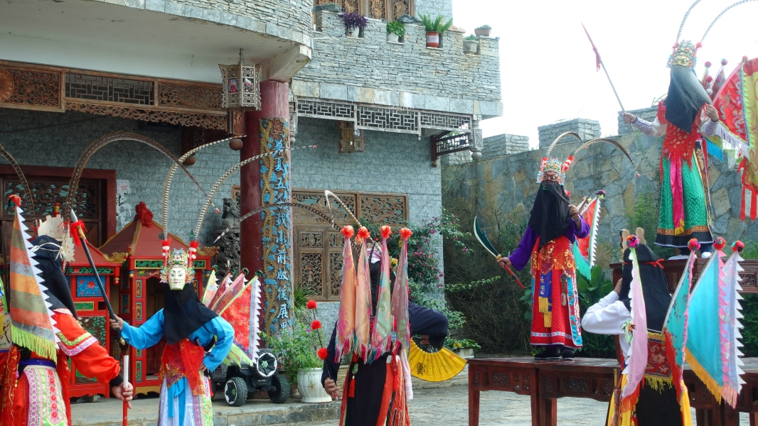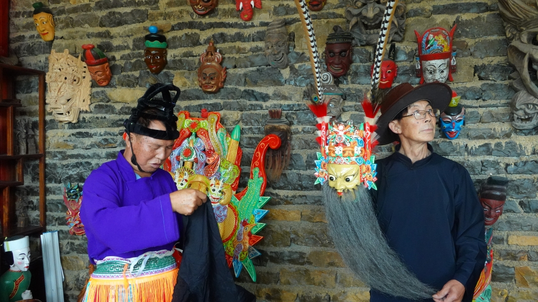 地戏面具俗称“脸子”,是地戏表演中的灵魂道具,不同于其他戏曲需绘制脸谱,地戏演员仅需佩戴面具便可迅速入戏,形神兼备。“没有脸子,就没有地戏”的说法,道尽了它的重要性。所谓“脸为面具,子为角色”,一面面具便代表一位历史人物,蕴含忠义、英勇、智慧等精神意象,承载着地戏独有的家国情怀与民族精神。实践队首站来到秦发忠非遗工坊,恰逢工坊筹备地戏演出,队员们有幸全程观摩演员扮妆过程。演员以面具头盔支架为支撑将面具稳稳固定于额头,配以灵动的翎子和飘逸的胡须,原本朴素的扮相因面具的加持而瞬间变得生动立体,历史人物形象呼之欲出,令人直观感受到了“面具即角色”的奇妙联结。