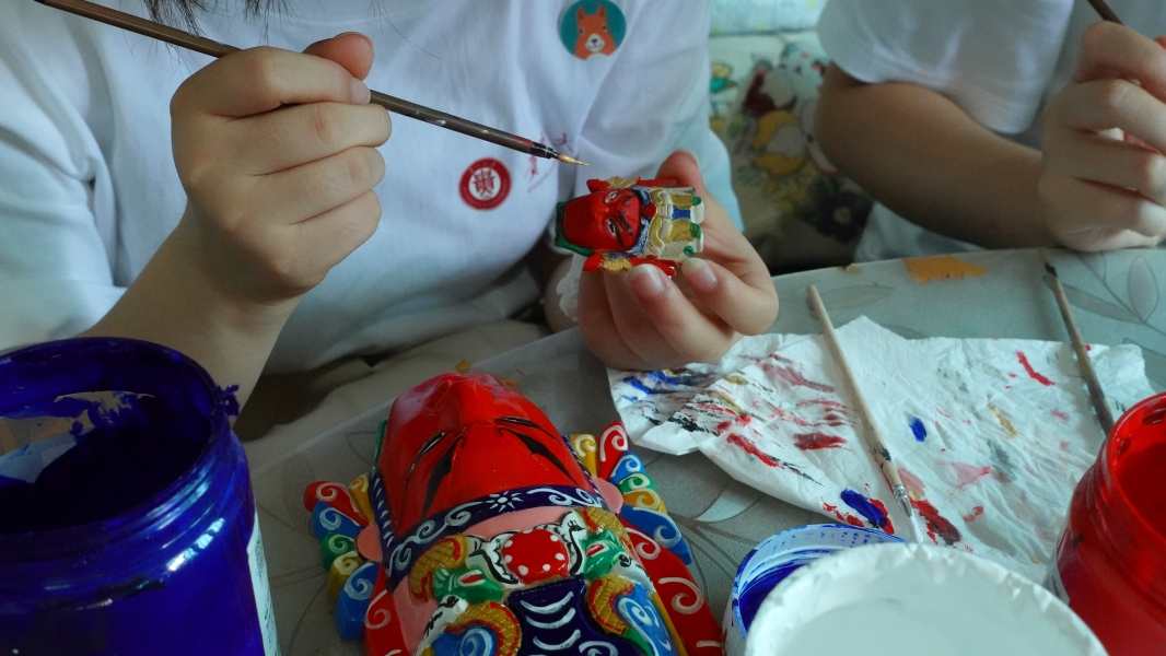 在匠人师傅的指导下,实践队员亲身体验地戏面具的制作过程,悟造型之技艺,识人物之神韵,明忠义之精神。每位队员均拿起刻刀,尝试雕琢基础轮廓,简单的线条勾勒便对手部稳定性提出较高要求,稍有不慎,原本圆润的眉形便会歪斜。在上色环节中,周明老师特别强调:“不同英雄人物在每个人心中的感彩是不同的,但其固有的特征不能改变,可以结合自己的理解去上色,但主体特征不能变。”面具艺术的表达既要有情感的参与,也必须尊重文化的原型与精神内核。人物可以有不同的情感共鸣,但忠勇仁义、舍身为国不可动摇。