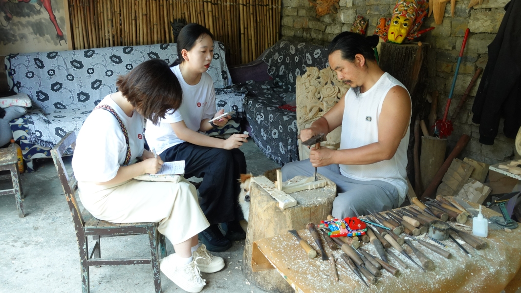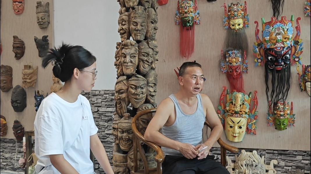 从胡师傅对技艺的坚守中深受触动,实践队走进明艺木雕工坊进一步探寻地戏面具的艺术世界。在与非物质文化遗产代表性传承人周明老师的交流中,队员们深入了解了面具的选材用料、人物塑造、文化内涵与创新实践,既观其形之巧,亦悟其魂之刚。 谈及面具雕刻的学习与传承,周师傅语重心长地说:“学好这门手艺,必须具备三个条件:一是喜欢,二是天赋,三是沉静。” 喜爱是文化传承的情感起点,天赋是技艺提升的基础,而沉静则是一种专注技艺、沉心于传统的文化态度。