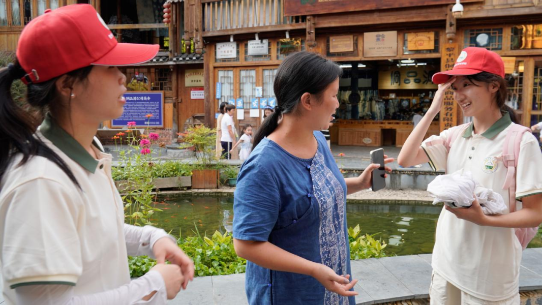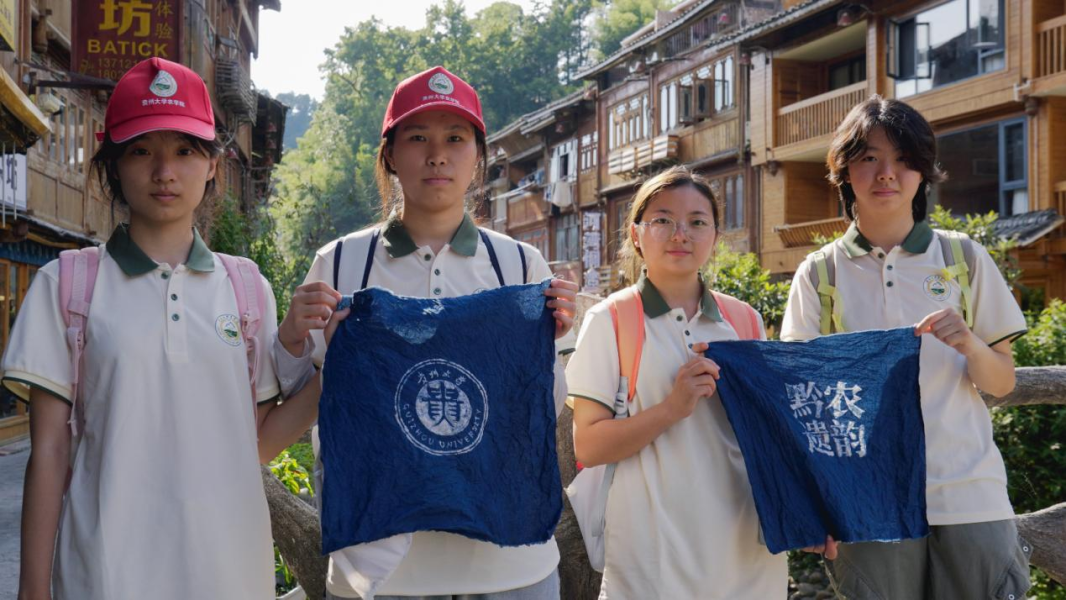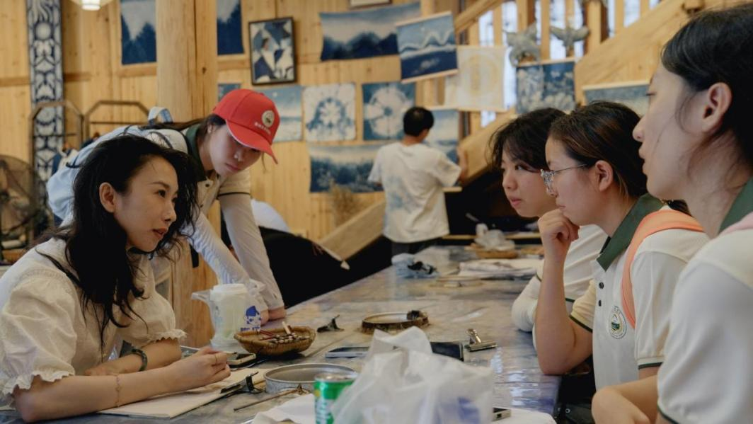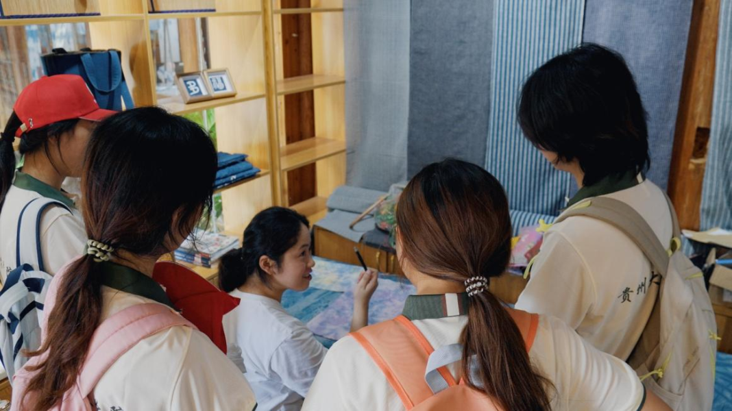 非遗的生命力,藏在传承者的坚守与创新里。实践队走进省级非遗蓝靛染技艺传承人陆勇妹的“侗品源”店铺,她指着缸中靛蓝染料介绍:“从6岁跟着母亲学靛染,如今合作社已带动周边村寨1200余名妇女灵活就业,就是想让老手艺活下去、传下去。”她带领团队将蓝染融入现代设计,开发文创产品,还通过非遗培训班培养年轻人,“传统要接上时代的地气,才能走得远”。