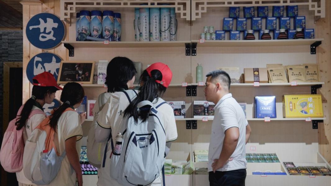 随后,实践队在贵州苗侗医药文化体验中心探索传统医药的传承与活化。店内工作人员热情接待,从品牌理念的初心坚守,到苗侗医药的发展脉络,从传统技艺与现代理念的融合创新,再到特色疗法的独特疗效,细致讲解让队员们对民族医药的传承逻辑有了系统认知。交流中,工作人员还重点推荐了“活络油”“瑶浴药包”等经典外用制剂,以及融入养生理念的创新产品“庙方青霜古藤奶茶”。从传统药材的炮制智慧到现代康养产品的开发思路,队员们在实物观察与讲解中深刻体会到:民族医药不仅承载着治病救人的文化价值,更在当代创新中焕发出助力民生增收的经济活力,让传统医药的传承之路更具生命力。