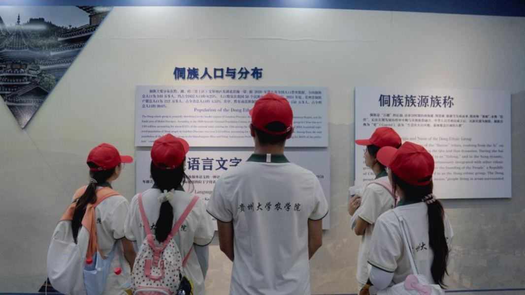 首先,实践队在侗族文化展示中心解码侗寨文化的历史脉络。成员们刚进入景区,就先进入到展示中心参观。从侗族历史溯源、族群分布、语言演变,到鼓楼建筑智慧、农耕习俗与节庆传统,丰富的图文、实物与解说让队员们系统触摸到文化的完整脉络。其中,队员们重点聚焦国家级非遗“侗族大歌”,通过多种方式沉浸式感受其“多声部无伴奏合唱”的独特魅力——用人声交织模拟自然之景,歌声里藏着侗族的情感与文化密码,让初入侗寨的探访更添厚重与鲜活。