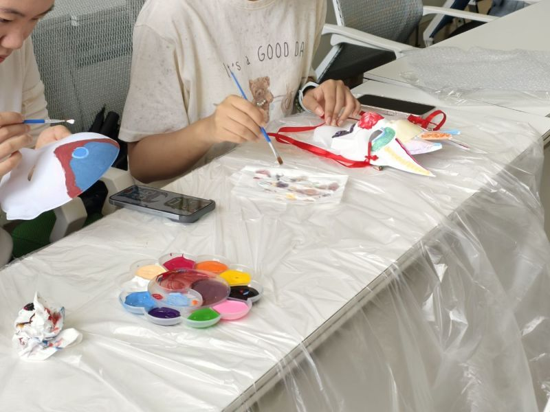 在创意傩面彩绘环节,参与学生有序领取了提前准备的空白面具、丙烯颜料、画笔等制作材料,在工作人员指导下提前构思面具的色彩与纹样。在用画笔描绘面具的时候,现场气氛欢快,同学们用丰富新颖的色彩搭配和图案纹样对傩面具进行绘制。