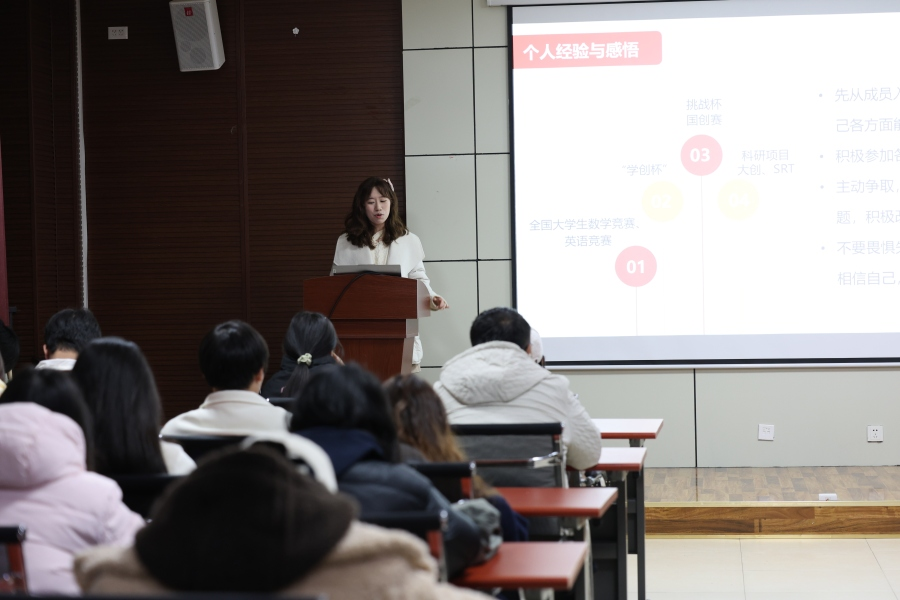 为满足不同专业、不同阶段同学的科创发展需求,金芷名香系统介绍多元化科创项目,全面梳理了各类赛事的核心特色、参与路径和备赛重点。她重点讲解“学创杯”全国大学生创业综合模拟大赛的赛事规则与实战技巧,分享全国大学生数学竞赛、英语竞赛的备考方法与答题技巧,并详细解读了SRT计划(大学生研究训练计划)、大学生创新创业训练计划的申报流程、选题方向和成果要求,帮助同学们对各类科创赛事形成更为全面、系统的认知。